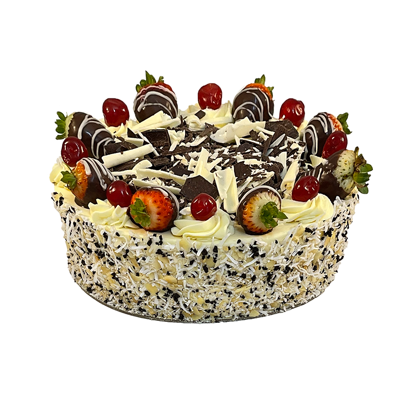 Three layers of chocolate sponge are filled with custard, vanilla cream, mixed nuts, chocolate-dipped strawberries, glazed cherries, and adorned with marble chocolate curls for a decadent treat