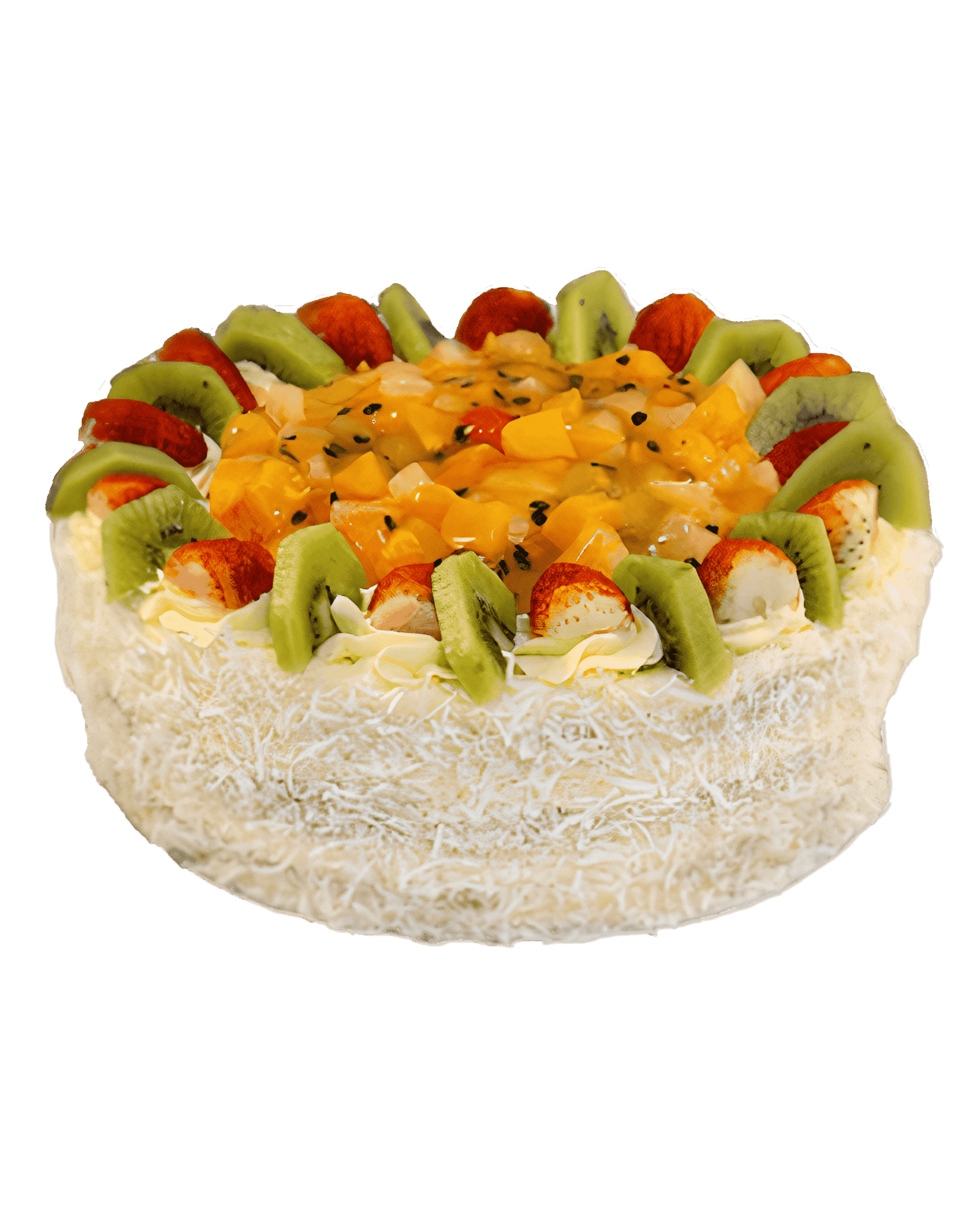 Three layers of vanilla sponge are filled with luscious passion fruit cream, vibrant fruit salad, and sprinkled with shredded coconut. The addition of tangy passion fruit filling adds a delightful tropical twist. This treat promises a harmonious blend of flavors and textures for a truly delightful experience