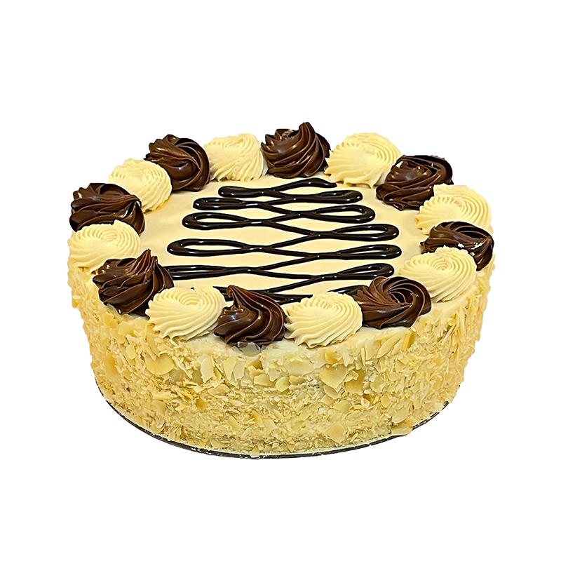 Three layers of vanilla sponge are filled with hazelnut cream and adorned with a ring of crunchy almonds for a delightful treat, promising a symphony of flavors and textures